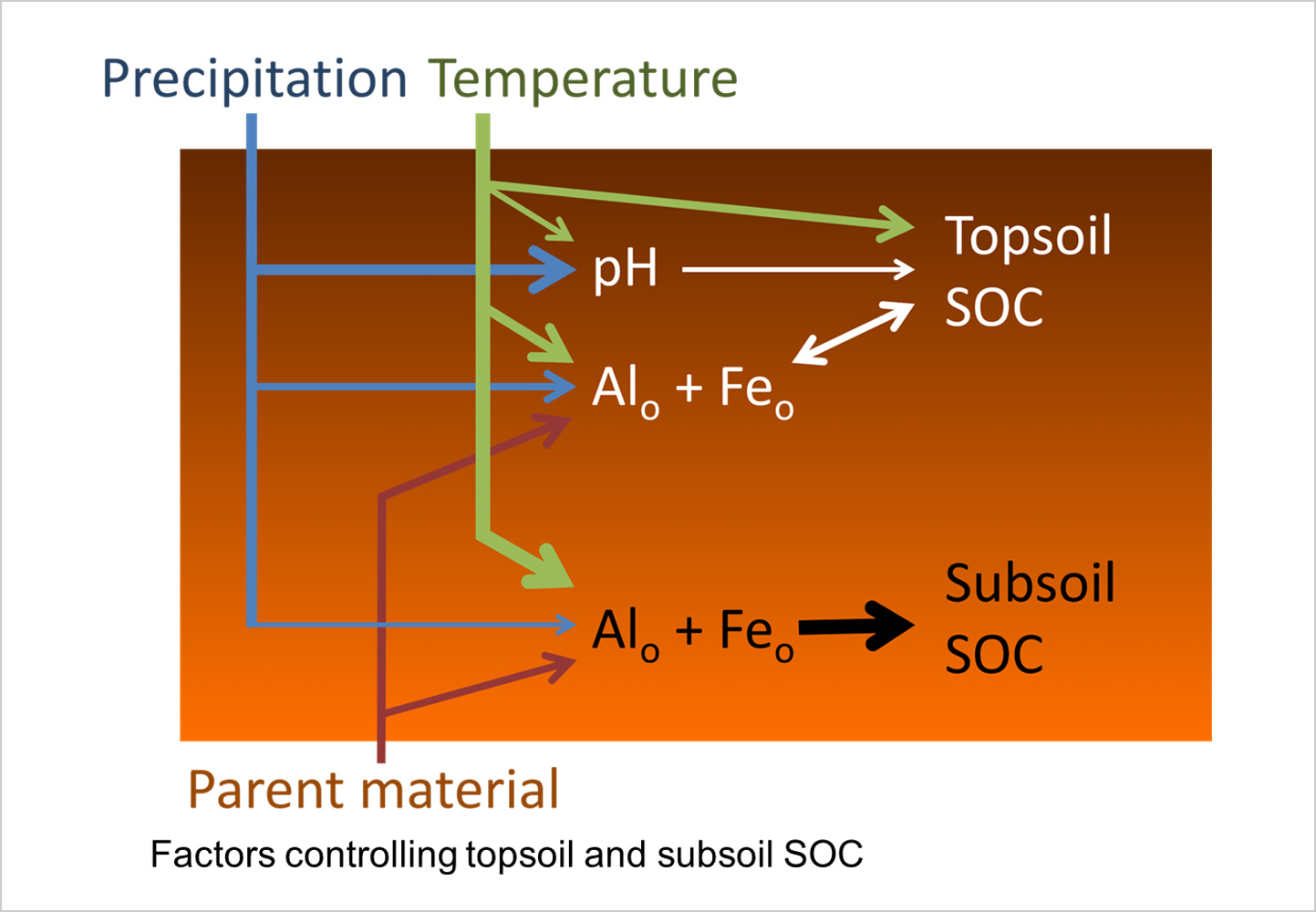 本研究は、気候調節や生態系維持に不可欠な土壌有機炭素(SOC)の蓄積を支配する要因を、熱帯・温帯の非火山性地域において、土壌層位(深さ)別に解明したものです。ランダムフォレスト(RFR)と構造方程式モデリング(SEM)を用いた解析により、表層土では気温やpHに加え、活性Al/FeとSOCが互いを安定化させ合う「双方向の相互作用」が確認された一方、下層土では活性Al/FeがSOC蓄積量を一方的に決定する要因であることが判明しました。さらに、気候(有効降水量)や母材(母岩)の化学組成は、SOCに直接作用するのではなく、土壌中の活性Al/Feの生成量を調節することを通じて「間接的」に炭素蓄積量を制御を支配しているという重要な経路を特定しました。これらの知見は、非火山性土壌においても活性Al/Feを基軸とした鉱物的な安定化が炭素循環の鍵であることを示しており、土壌の深層部まで含めた高精度なSOC予測モデルの構築や、地球温暖化対策における炭素隔離ポテンシャルの正確な評価に大きく貢献するものです。