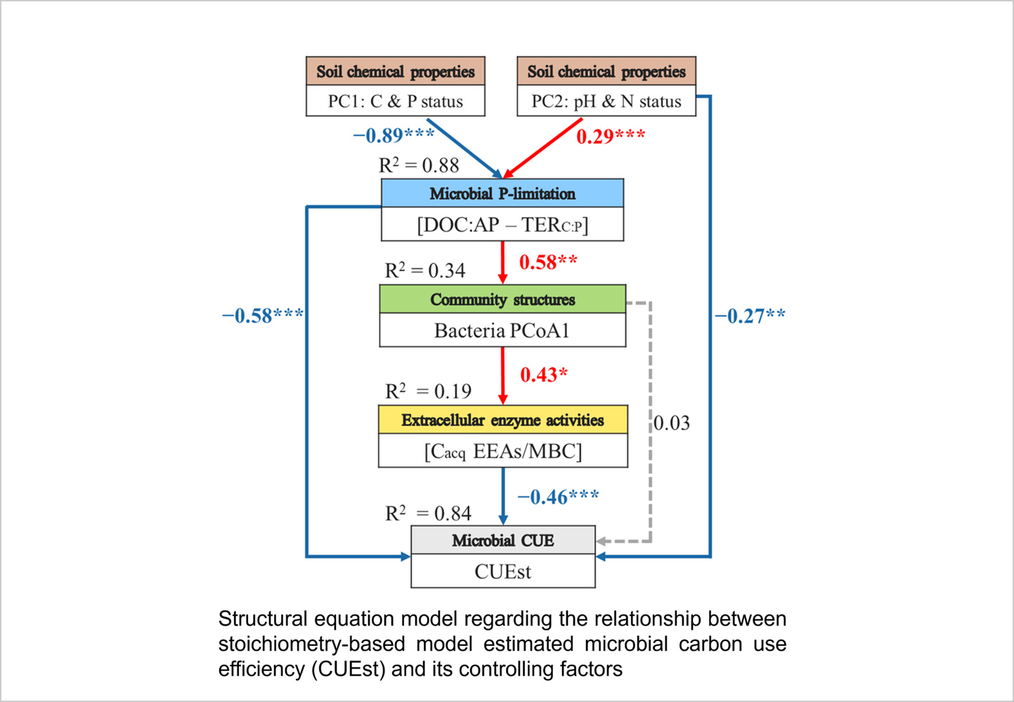 微生物の炭素利用効率(CUE)は、微生物バイオマスとして蓄積される炭素と、二酸化炭素として大気に放出される炭素のバランスを決定するため、土壌有機炭素(SOC)動態の極めて重要な指標となります。本研究では、日本の黒ボク土において36年間継続された長期施肥試験を通じ、養分供給が微生物の代謝戦略およびCUEに与える影響を明らかにしました。解析の結果、微生物のCUEを向上させるには、炭素およびリン(P)の利用可能性を高め、それらのバランスを最適化することで、微生物のP制限を緩和することが不可欠であることが示されました。この制限緩和は、CUEを直接的に改善するだけでなく、優占する微生物群集を「資源獲得型」から「高収穫型」へとシフトさせる効果も持ちます。これにより、炭素獲得酵素の産生を抑制して代謝エネルギーの節約が可能となり、間接的にもCUEを高める結果となりました。長期的なNPK施肥は、P制限の緩和とライフ戦略の転換を通じてCUEを大幅に向上させました(P欠乏区:0.20→NPK区:0.35)。この結果は、適切なリン管理が「養分獲得」と「エネルギー節約」のバランスを最適化し、黒ボク土の炭素蓄積を最大化する鍵であることを示しています。