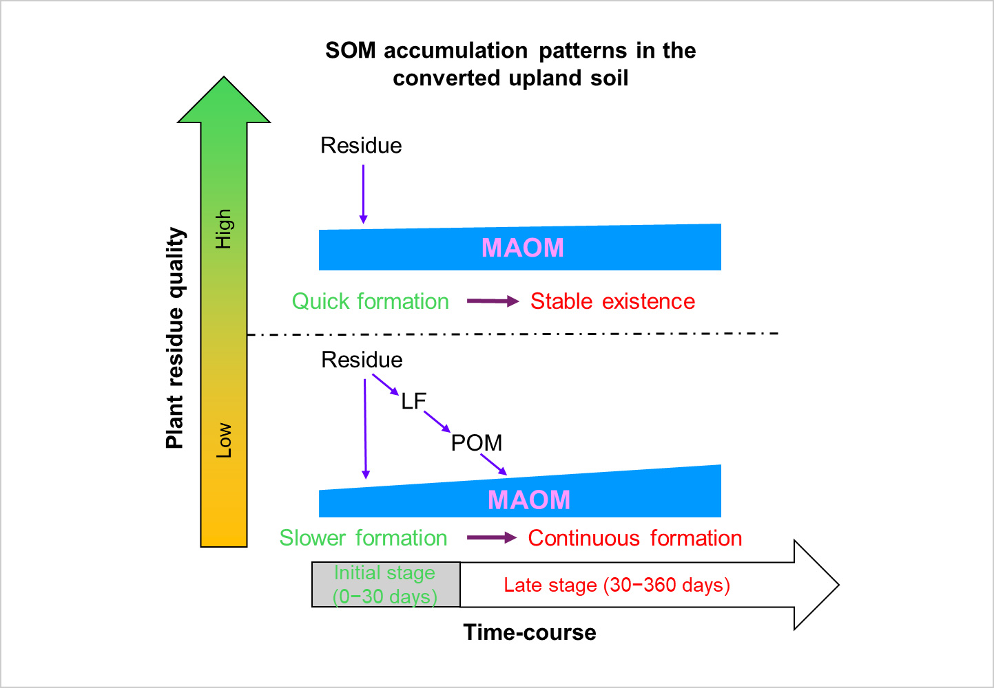 水田から畑地への転換は、土壌環境や供給される植物残渣(根や茎葉)の質を劇的に変化させ、土壌有機物の動態に大きな影響を与えます。本研究では、13C/15Nでラベリングしたダイズとトウモロコシの異なる部位を用い、残渣の質(C:N比やリグニン含量)が土壌有機炭素中最も安定である鉱物結合有機物(MAOM)の形成プロセスに与える影響を1年間の圃場試験で解明しまし。解析の結果、残渣の質がMAOM形成の「速度」と「経路」を決定する要因であることが明らかになりました。ダイズ葉などの高品質な残渣は、分解初期(30日以内)に微生物を介して迅速かつ安定なMAOMを形成した一方、低品質な残渣は粒子状有機物低分解(POM)からMAOMへと長期的に転換され続ける経路を辿りました。最終的には、初期分解と持続的な転換のバランスに優れたダイズ根が最大のMAOM蓄積量(28.3%)を示しました。本研究は、転換畑の炭素蓄積を向上するため、供給する残渣の質に基づいた管理戦略が極めて重要であることを示唆しています。